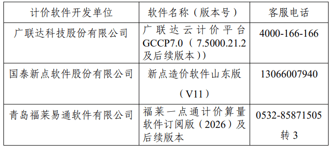 为落实省发展改革委、省住房城乡建设厅关于执行《建设工程工程量清单计价标准》(GB/T50500 - 2024)的部署安排,市公共资源交易中心已完成东营市工程建设电子交易系统清单数据接口升级改造工作。期间市公共资源交易中心公开征集并组织三家计价软件单位(广联达科技股份有限公司、国泰新点软件股份有限公司、青岛福莱易通软件有限公司)开展多轮接口适配联调测试。经测试,上述计价软件公司均确认能够稳定适配东营市工程建设电子交易系统的招标/投标文件制作工具、开标子系统、评标子系统等全交易环节,生成文件完全符合2024版清单计价标准要求,无兼容冲突及数据传输异常问题,测试结果合格。现将联调测试合格的计价软件开发单位名称、软件版本号及客服电话信息(排名不分先后)公布如下: